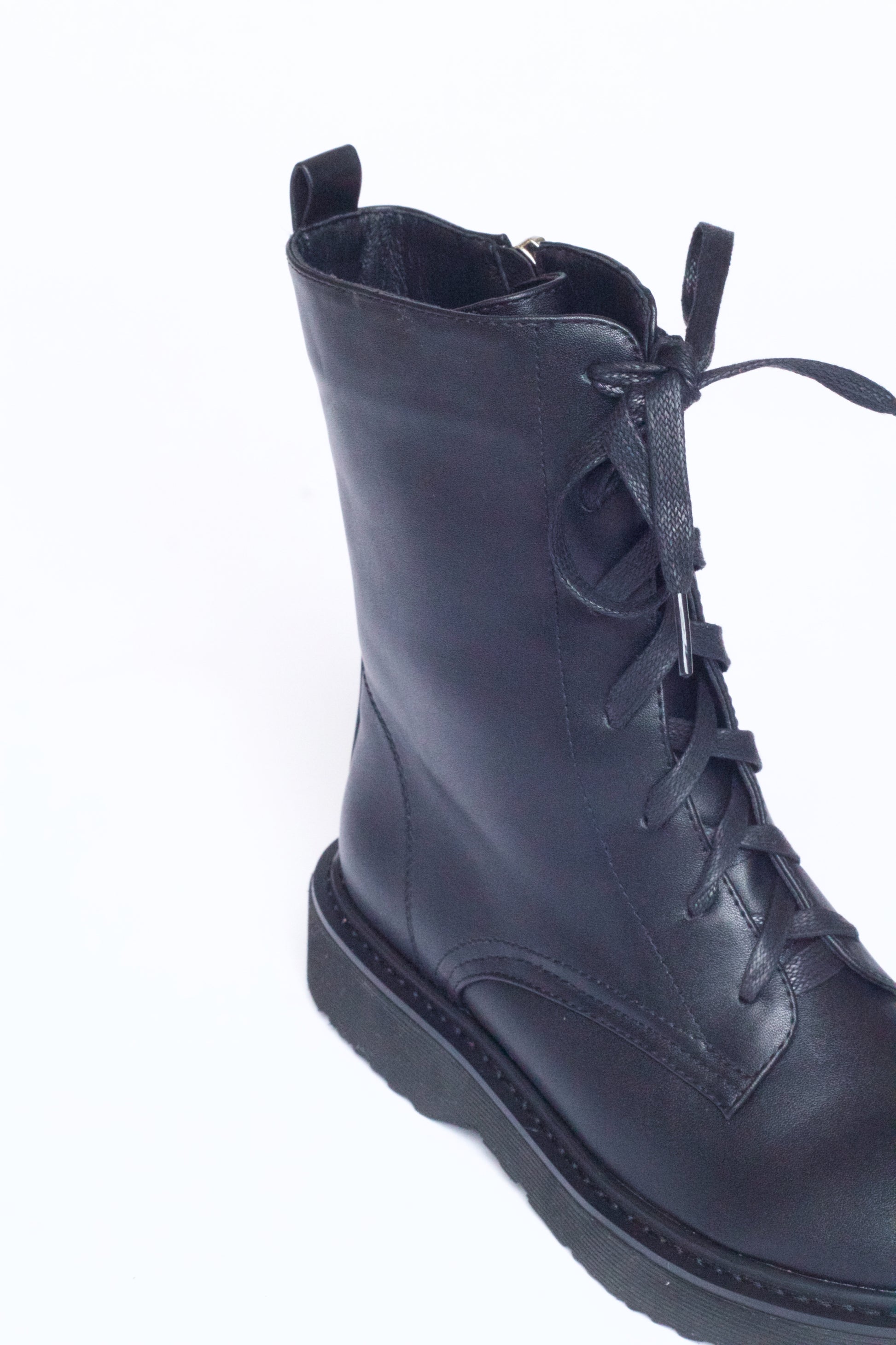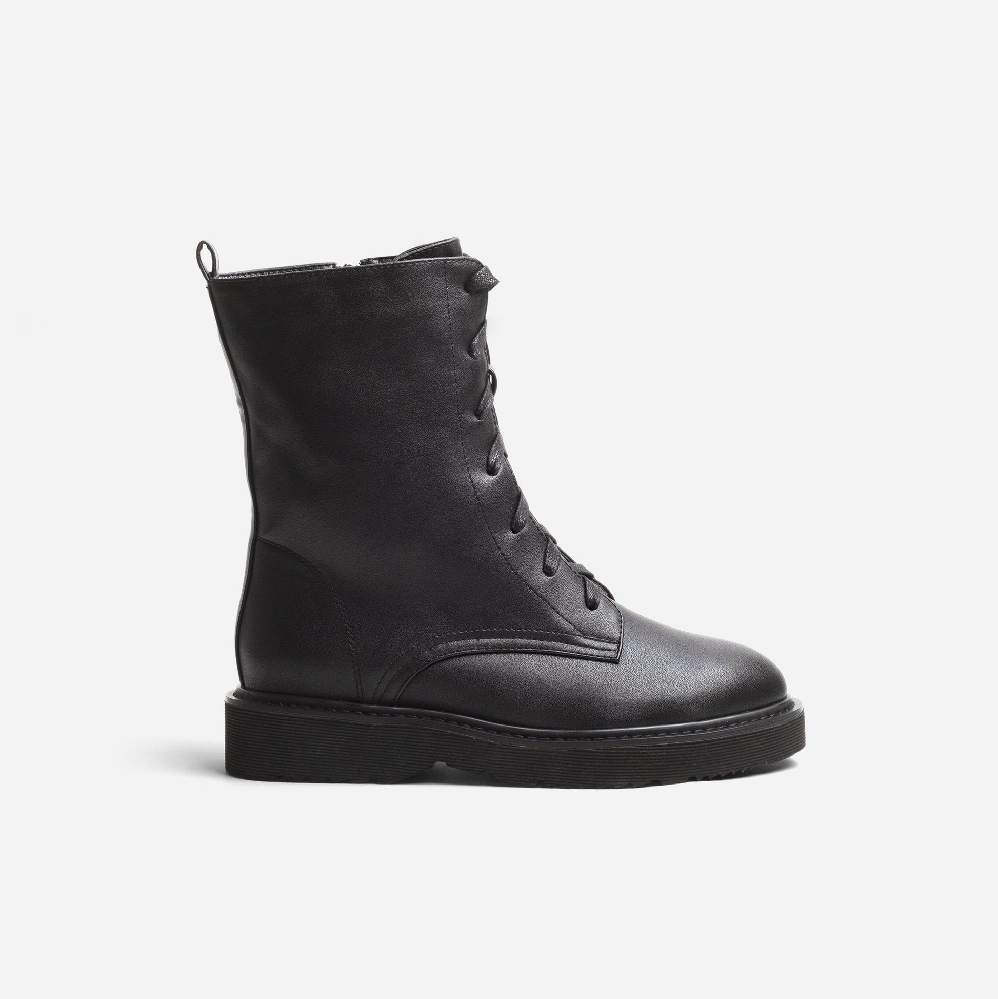 The ARI boots are a classic biker combat style set on a cushioned sole and a lace up front. Crafted in soft black faux leather and designed with a side zipper fastening, making them easy to take on and off. Suitable for both narrow and wider feet.