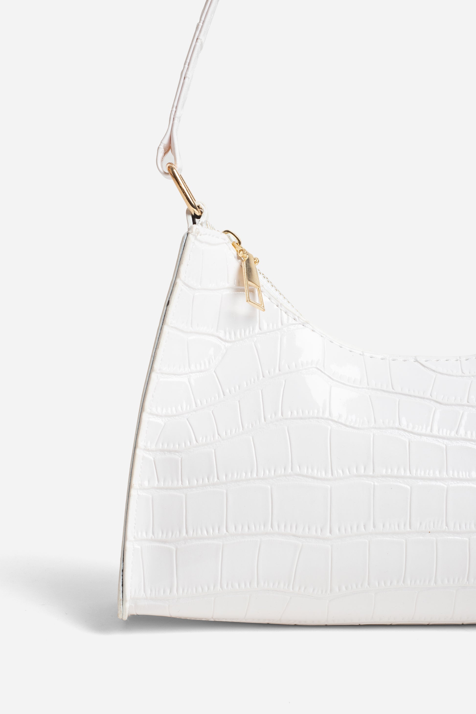 The LUCIA white mini bag is a classic design made from shiny faux croc leather. It sits perfectly on the shoulder, making it lightweight and easy to carry. The buckle details and zipper fastening are a contrasting gold tone.