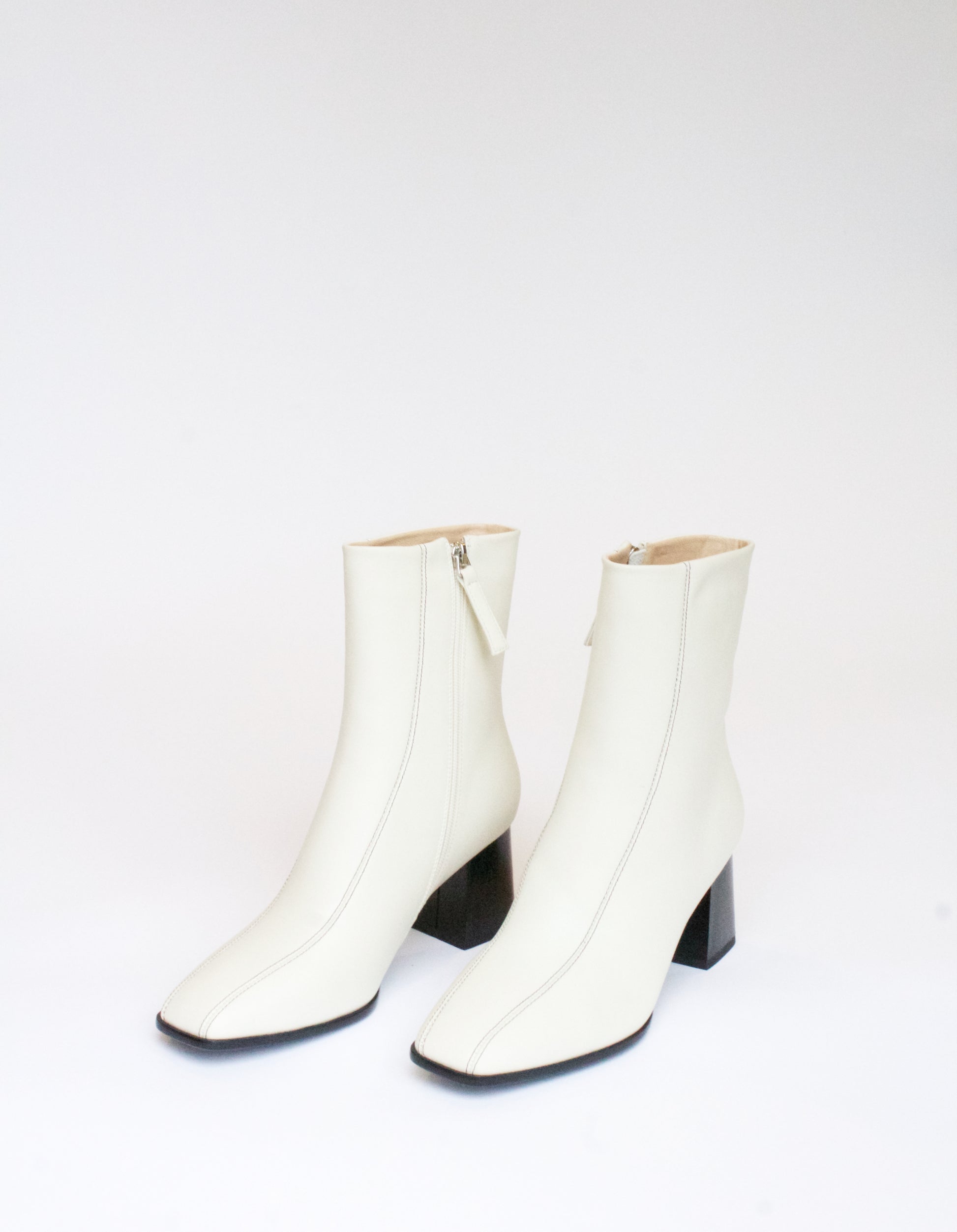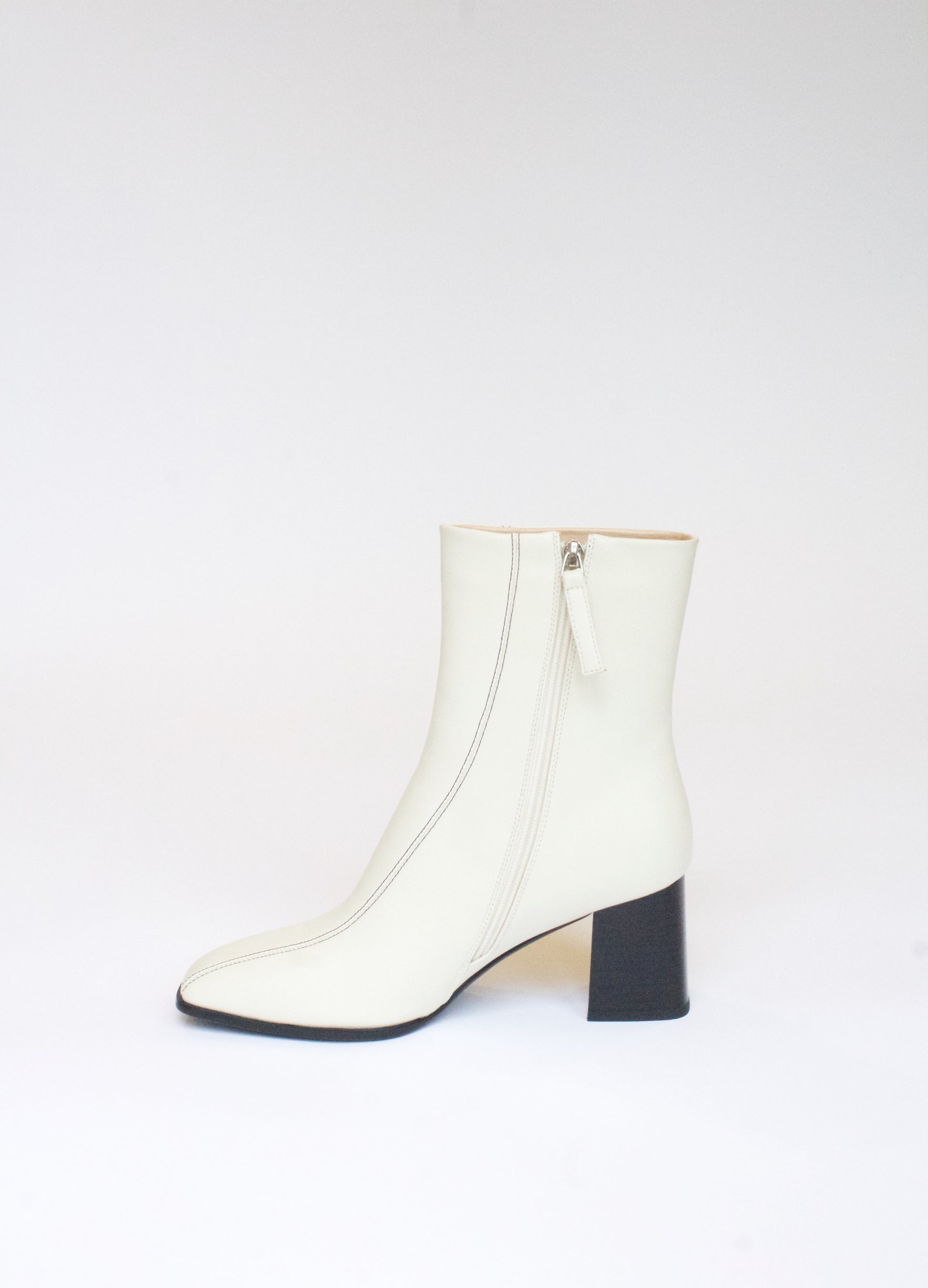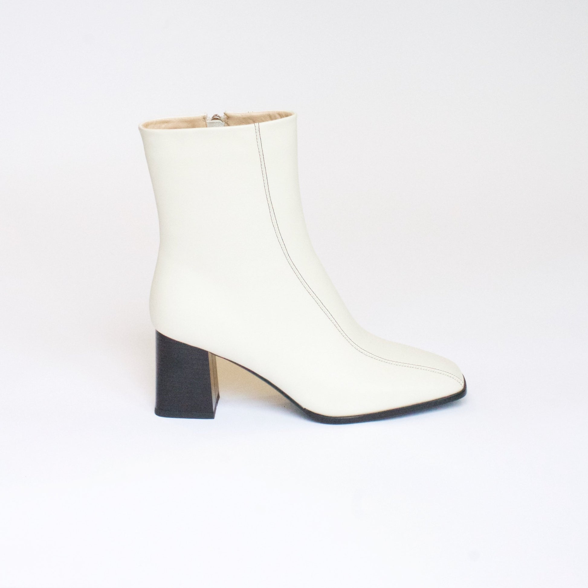 The ROKA boots are designed with a square shaped toe and set on a natural rubber sole. The block heel of 7 cm, makes them easy to wear and the sleek style means they are versatile for different occasions. Crafted in a soft up-cycled faux leather with contrast black stitching running up the centre front.